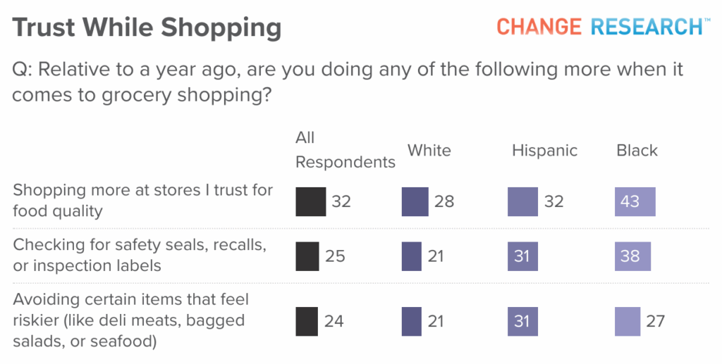 Food safety concerns may be prompting Americans to take more active precautions in their shopping habits. About one-third of Americans (32%) say they now shop more frequently at stores they “trust for quality” than they did a year ago.