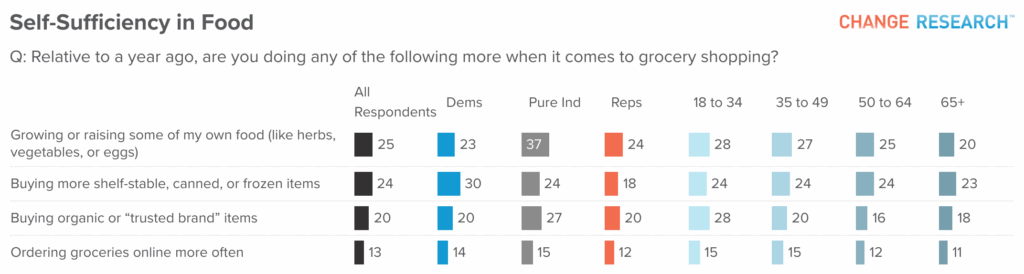 One of the more striking findings is how many Americans are producing food themselves. A quarter of respondents (25%) say they are growing or raising some of their own food, such as herbs, vegetables, or eggs. Among pure Independents, that number climbs to 37%.