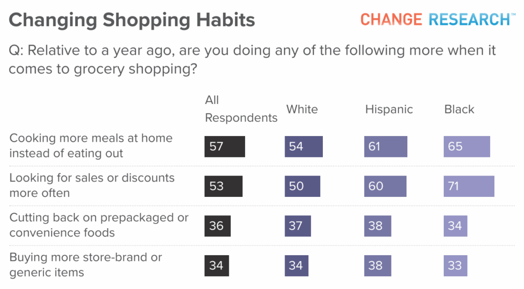 Price also plays a central role in grocery shopping. More than half of Americans (53%) say they are looking for sales and discounts more often than a year ago. This is especially true for Democrats (68%) and Black respondents (71%). Others report cutting back on prepackaged foods (36%) or switching to store-brand and generic products (34%).