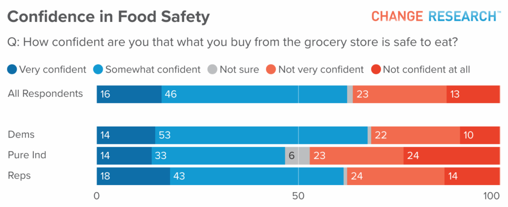 Nearly four in ten Americans (37%) lack confidence in grocery store food safety, with 23% reporting they are “not very confident” and 13% stating they are “not confident at all.” These concerns cross demographic lines but show interesting variations. Democrats show the highest levels of trust in grocery store food safety at 67%, while only 47% of Pure Independents say they are confident in grocery food safety.