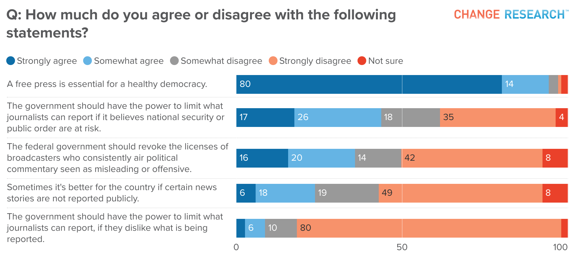 Despite skepticism about how news is influenced, Americans overwhelmingly agree that a free press is essential for democracy. Ninety-four percent strongly or somewhat agree with this principle. This support cuts across party lines: 99% of Democrats, 92% of independents, and 90% of Republicans.