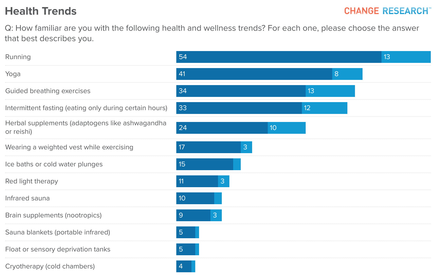 Beyond these common practices, participation drops. Just 20% have used weighted vests while exercising, 17% have tried ice baths or cold plunges, and only 12% have experienced cryotherapy.