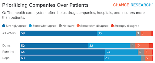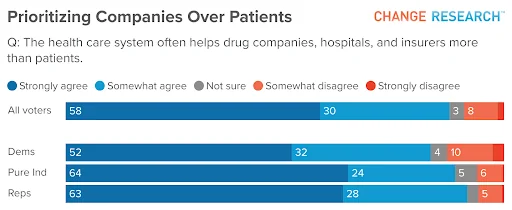 Eighty-eight percent of Americans agree that “the health care system often helps drug companies, hospitals, and insurers more than patients.” It’s a rare point of unity, shared by 83% of Democrats, 89% of independents, and 91% of Republicans.