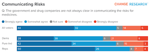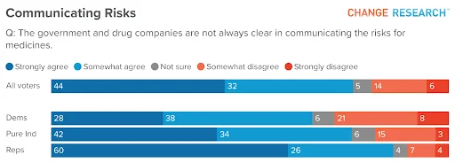 That skepticism extends to the way health risks are communicated. Three in four Americans (76%) believe “the government and drug companies are not always clear in communicating the risks for medicines,” including 66% of Democrats, 76% of independents, and 86% of Republicans.
