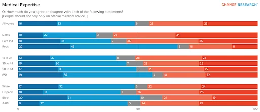 When asked whether “people should not rely only on official medical advice,” 49% agree while 45% disagree, revealing one of the survey’s most dramatic partisan splits. Two-thirds of Republicans (66%) agree, compared with 39% of independents and just 33% of Democrats.
