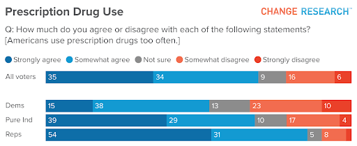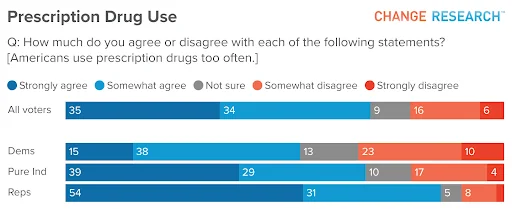 Nearly seven in ten Americans (69%) believe “Americans use prescription drugs too often.” That topline hides a significant partisan gap: 86% of Republicans agree, compared with 68% of independents and 53% of Democrats.