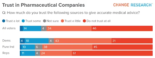 Just 16% of Americans say they trust pharmaceutical companies “a lot” or “some” to provide accurate medical advice, while 80% trust them “a little” or “not at all.”