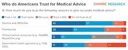 Doctors and OB-GYNs command the highest trust ratings in the survey, with 82% of respondents trusting them “a lot” or “some” for medical advice.