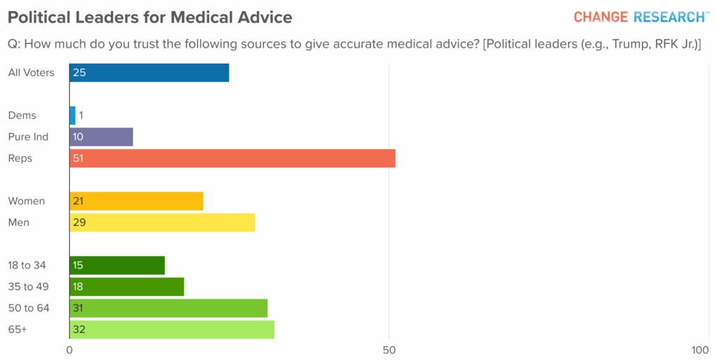 Age and gender show smaller but notable variations. Older Americans (32% of those 65 and older) are more likely than younger adults (15% of those 18–34) to trust politicians for health guidance. Women are slightly more trusting than men (29% vs. 21%), though skepticism is widespread across all groups.