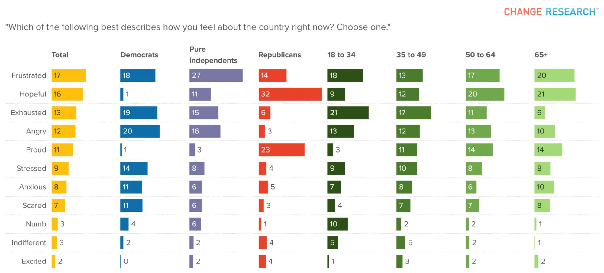 When we asked voters to describe how they feel about the country right now, frustrated (17%) and exhausted (13%) topped the list, followed by angry (12%) and anxious (7%). Sixteen percent say they feel hopeful, and 11% say they are proud. Stressed was chosen by 9% of voters overall.