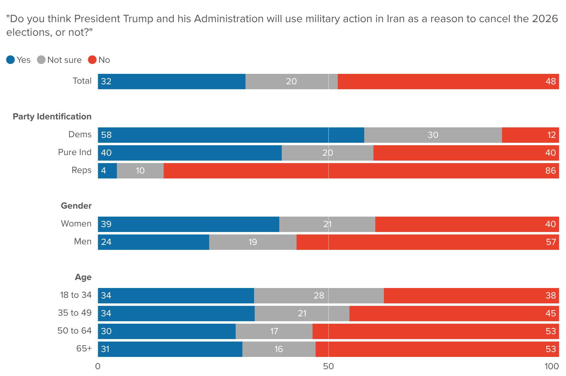The survey was fielded during the first two weeks of Operation Epic Fury, the joint U.S.–Israeli military campaign that began on February 28, 2026. By the time the poll finished fielding, American and Israeli strikes had killed Iranian Supreme Leader Ayatollah Ali Khamenei and dozens of senior officials, Iran had retaliated both militarily and by blocking access to the Strait of Hormus, and oil prices had risen more than 40%.
